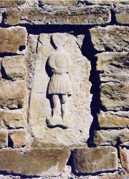 Fornella in arenaria raffigura un milite rivestito di cotta stile medioevo gotico tra ‘200 e ‘400,stretta in cintola,senz’armi con abbondanti calzari; frammento rinvenuto in frazione Chiazze.