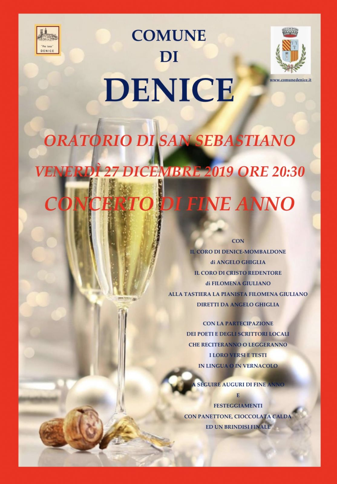 IL CORO DI DENICE-MOMBALDONE DI ANGELO GHIGLIA, IL CORO DI CRISTO REDENTORE DI FILOMENA GIULIANO, CON ALLA TASTIERA LA PIANISTA FILOMENA GIULIANO, DIRETTI DA ANGELO GHIGLIA E CON LA PARTECIPAZIONE DEI POETI E DEGLI SCRITTORI LOCALI CHE RECITERANNO O LEGGERANNO I LORO VERSI E TESTI IN LINGUA O IN VERNACOLO.
